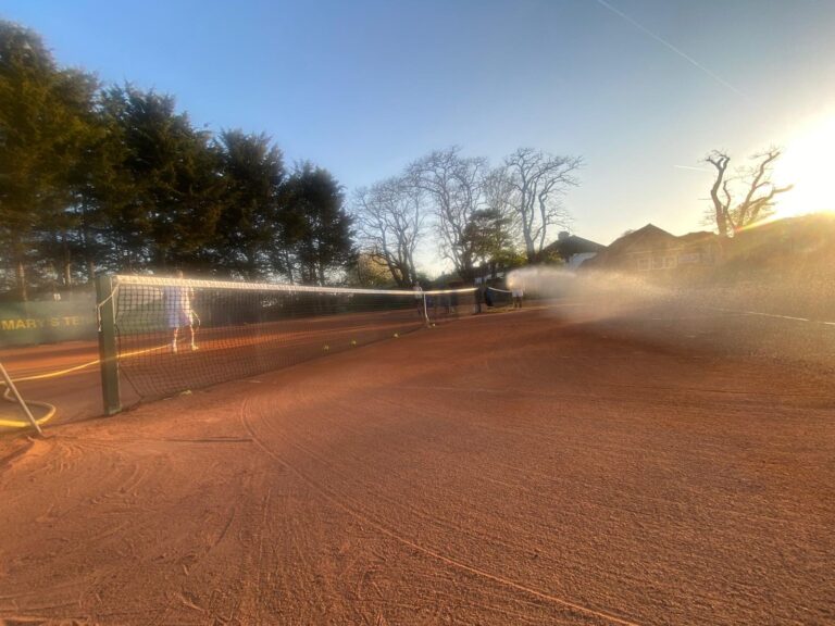 Clay courts have to be well cared for. In dry weather the clay has to be watered before play, and in exceptionally hot weather after each set. Fortunately we have a pressurised watering system enabling members to water a court in just two minutes.